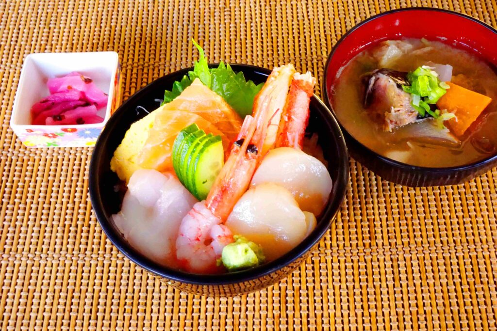 Sweet shirimp、Tuna、Salmon、Scallops、 Snow crab、、Salmon roe、Daily soup.