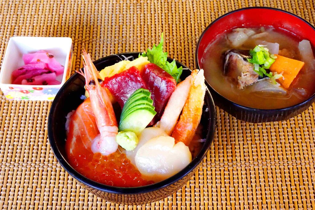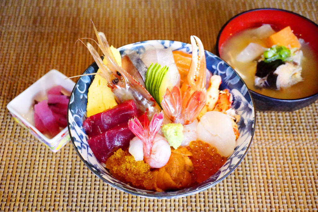 It is a Premium bowl with 10 kinds of seafood. Botton shirimp、 Salmon roe、 Tuna、 Salmon、 Scallops、 Greater amberjack、 Mackerel、 Japanese rolled omelet、 Sea urchin、 Snow crab、Daily soup.