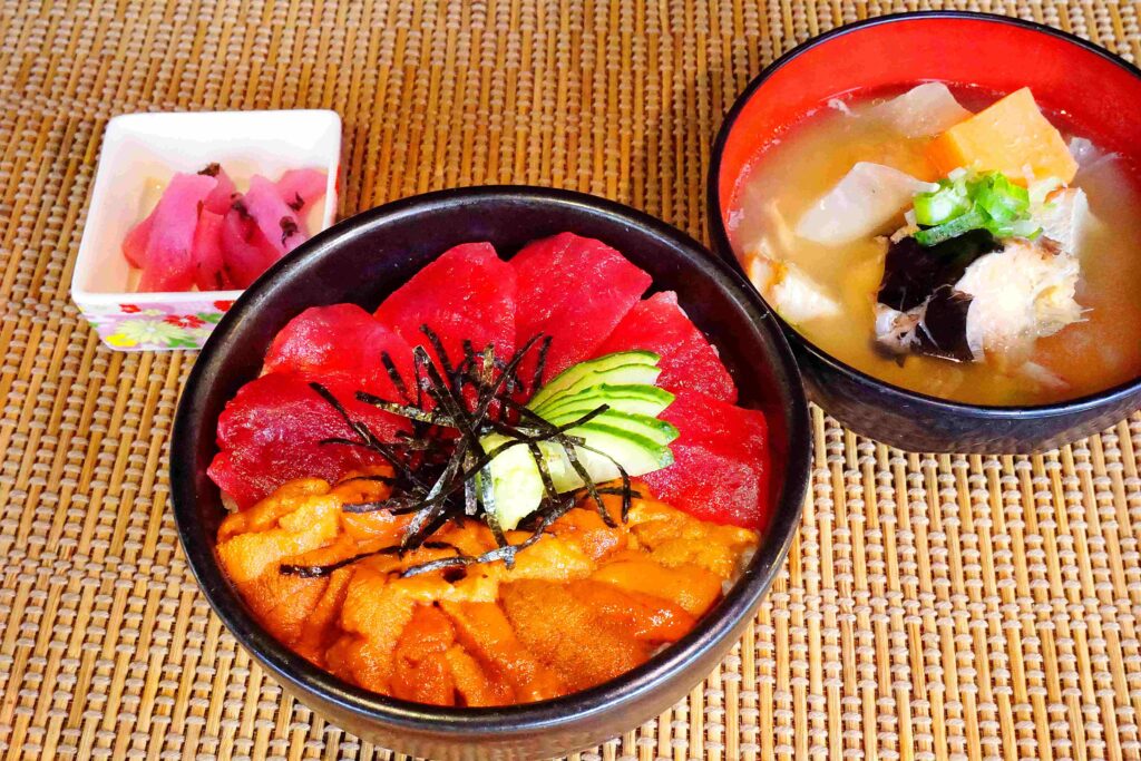 Salmon Roe and Sea Urchin Donburi. Traditional Donburi of Hokkaido. Daily soup.